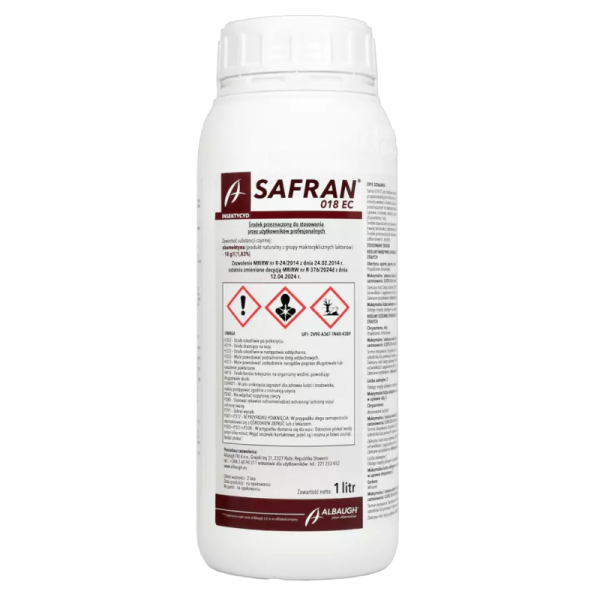 Safran 018 EC to preparat owadobójczy, środfek działa kontaktowo i żołądkowo, przeznaczony do walki z owadami szkodliwymi w uprawie gruszy, truskawki, maliny, jeżyny, oberżyny, ogórka, papryki, pomidora, chryzantemy i róży.